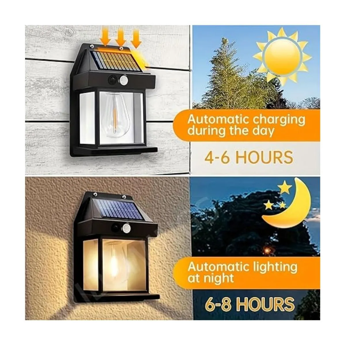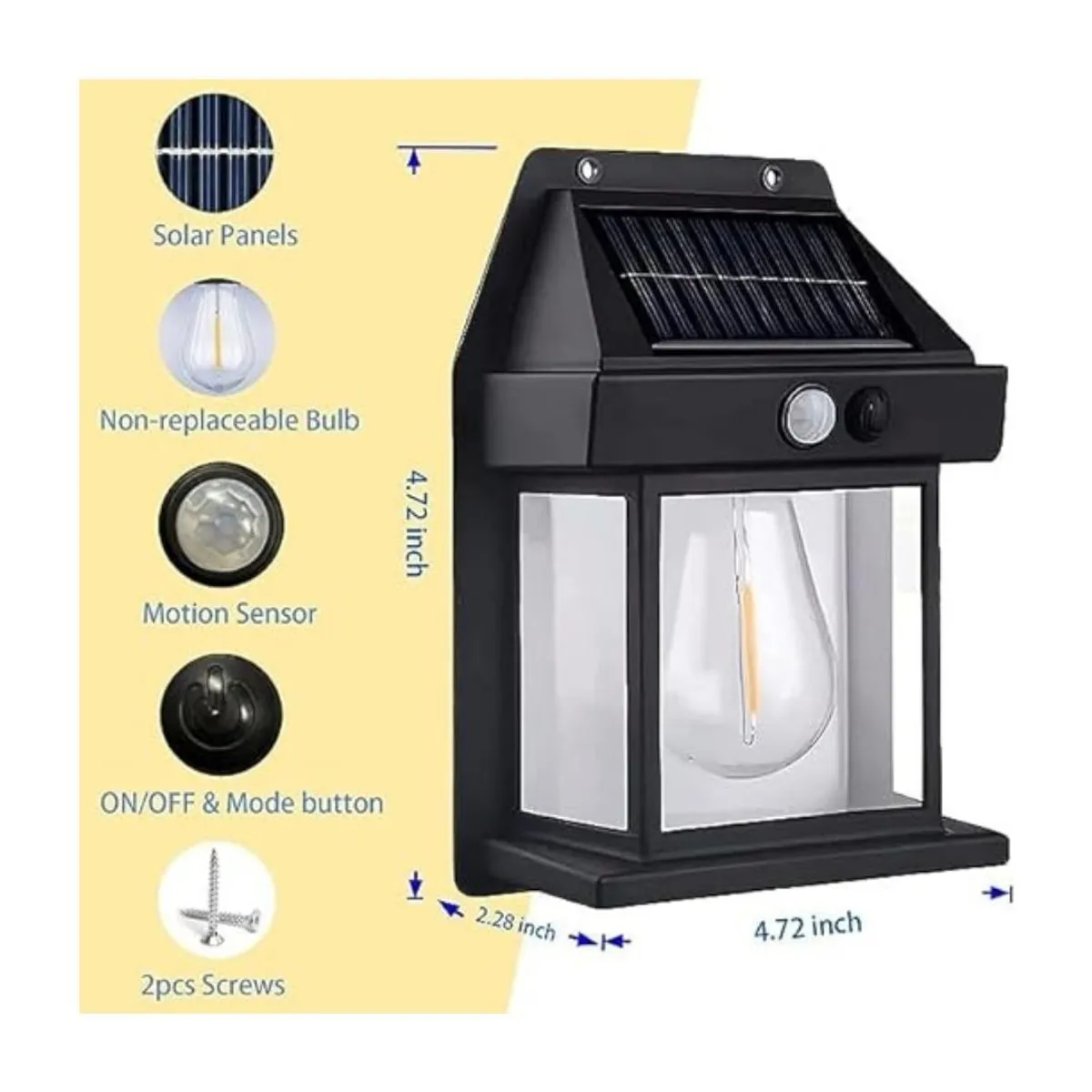 *Este farol solar de pared con luz cálida y sensor de movimiento es una excelente solución de iluminación exterior, ideal para entradas, patios, jardines, terrazas o balcones. Su diseño moderno y compacto combina eficiencia energética, seguridad y estilo, funcionando completamente con energía solar, sin necesidad de cables ni conexiones eléctricas.
